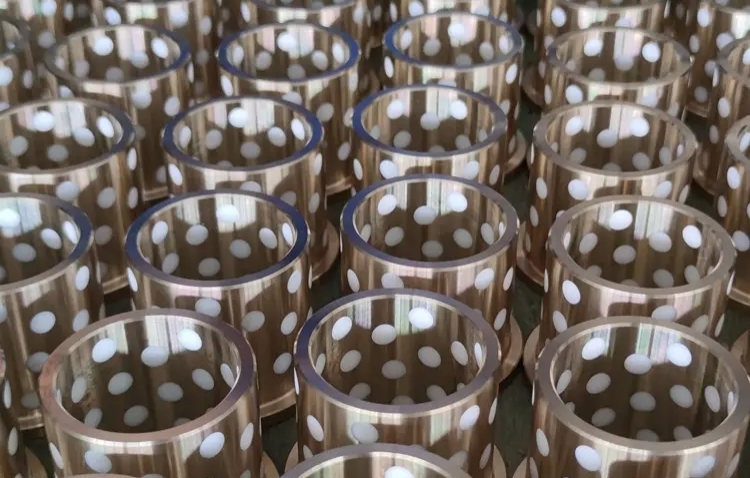 - Estructura: Orificios perforados en la matriz de bronce con una cobertura de superficie ≤30%, columnas de PTFE prensadas, formando una configuración de “lubricación sólida que soporta carga metálica”